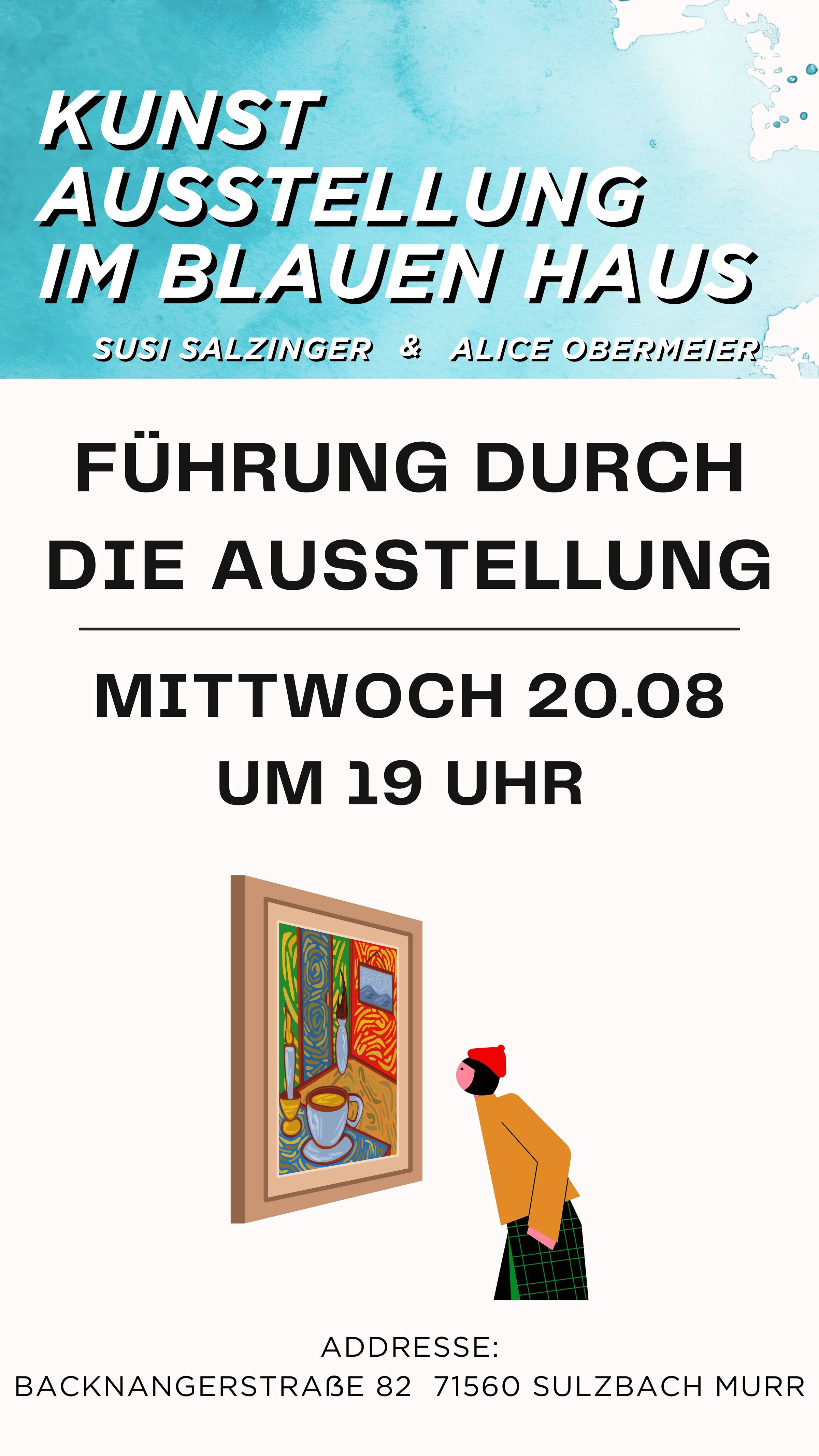Diesen Mittwochabend findet im Blauen Haus eine Führung durch die Ausstellung statt. Eine tolle Gelegenheit, die Werke in Ruhe anzuschauen und mehr über die Gedanken und Geschichten hinter den Kunstwerken zu erfahren.