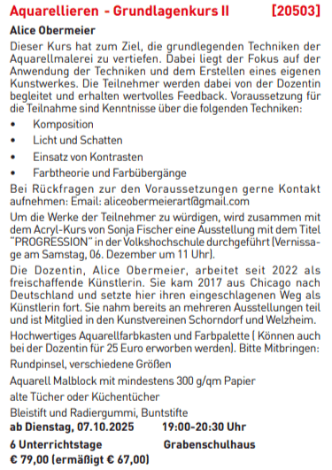 Ab dem 7. Oktober gebe ich den erweiterten Teil meines ersten Aquarellkurses an der Volkshochschule Murrhardt. Diesmal wartet etwas Besonderes auf uns: Am Ende werden die Teilnehmer gemeinsam der Acrylkurs-Gruppe ihre Werke in einer Ausstellung präsentieren. Es gibt noch freie Plätze!
