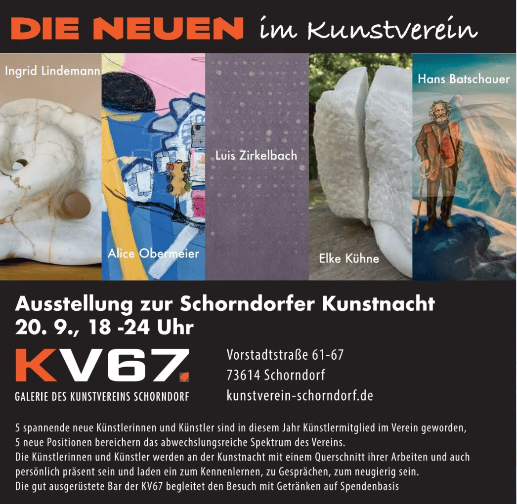 Diesmal stelle ich in der Galerie KV 67 gemeinsam mit den neuen Mitgliedern des Kunstvereins Schorndorf aus.