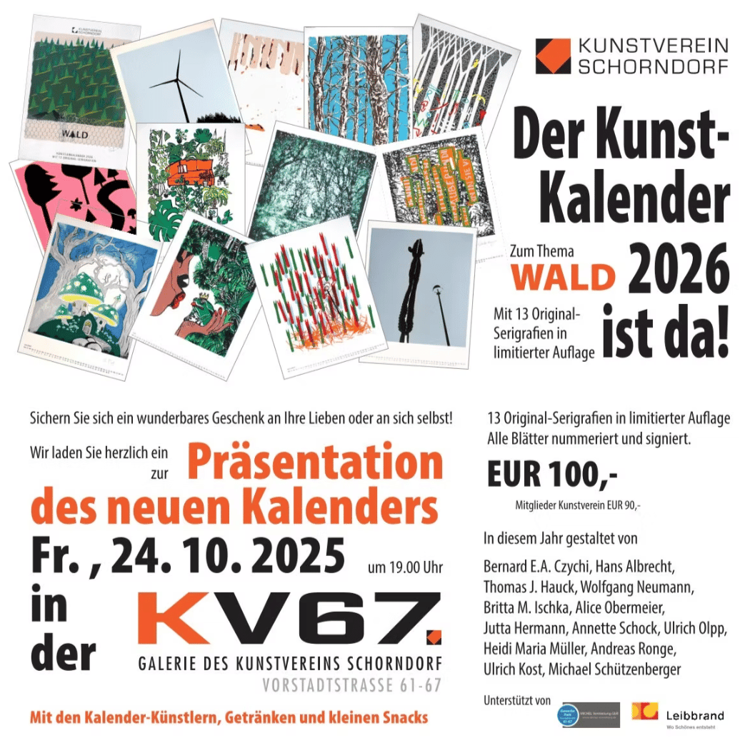Jedes Jahr gestaltet der Kunstverein Schorndorf einen Siebdruckkalender mit 13 originalen Siebdruckgrafiken in große A2 zu einem bestimmten Thema, hergestellt in der Siebdruckwerkstatt in Schorndorf.