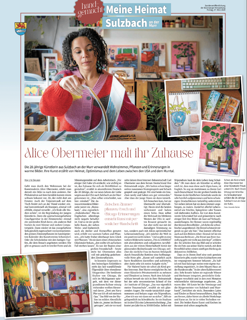 “Even as a child, Alice Obermeier received private lessons from an artist. After her move from America to Swabia, the 28-year-old now appreciates Sulzbach as an oasis of calm.”