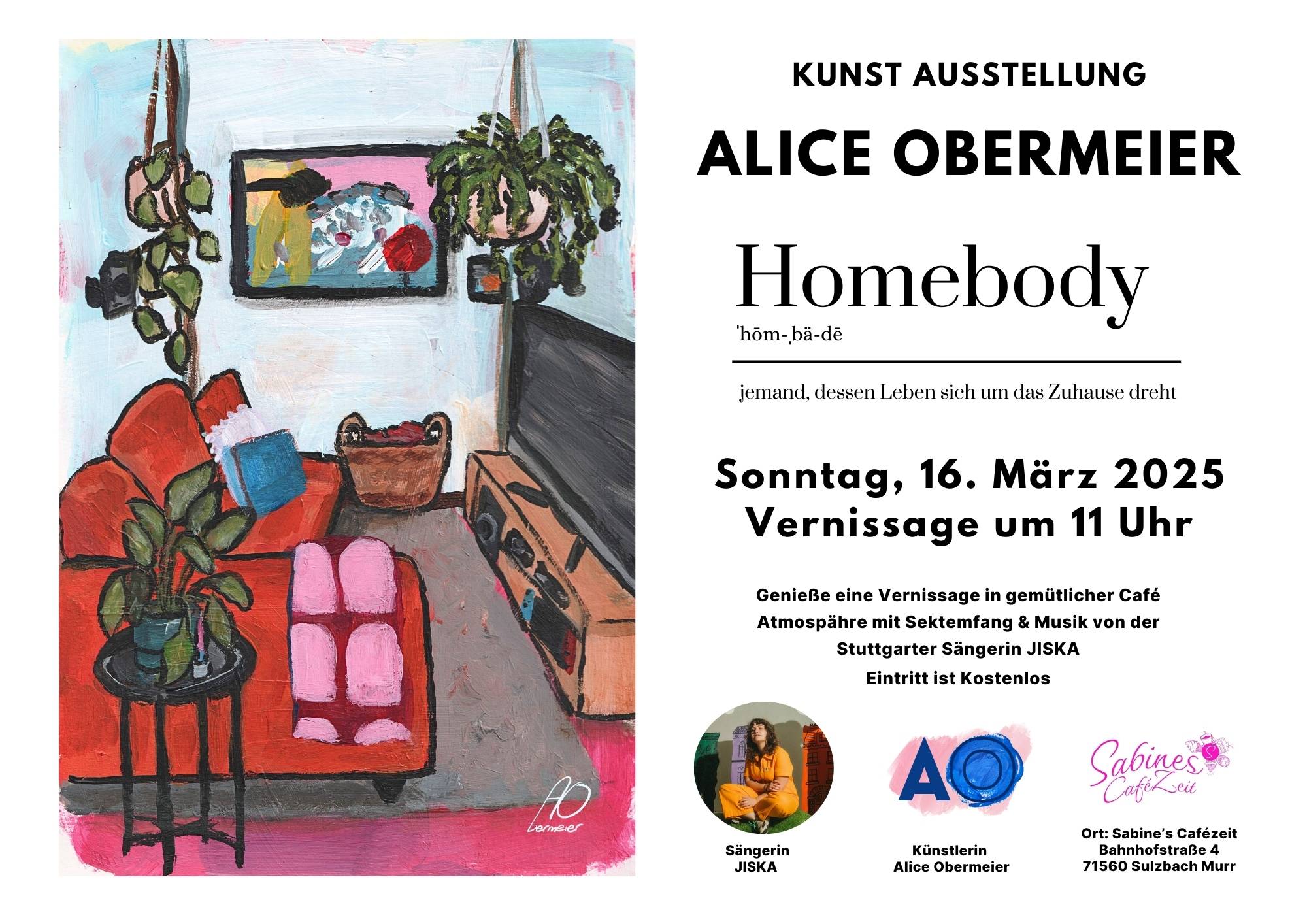 Hallo! In diesem Update erzähle ich über meine Vernissage am 19. März und die Kunstwerke aus meiner neuen Serie, “Homebody”. Vernissage "Homebody" 🏡💕 Eine wunderschöne Ausstellungseröffnung war es in Sabine's CaféZeit. 🩷 Es hat mich richtig gefreut, so viele Gäste begrüßen zu dürfen und die tolle Musik von Stuttgarter Sängerin JISKA zu hören! 🎤🎸 Hier ein Paar Impressionen: Ein Teil von die Performance bei der Vernissage von JISKA: HÖRE JISKAS MUSIK Neue Serie: "Homebody" 🏡💕 "Hygge" steht für...